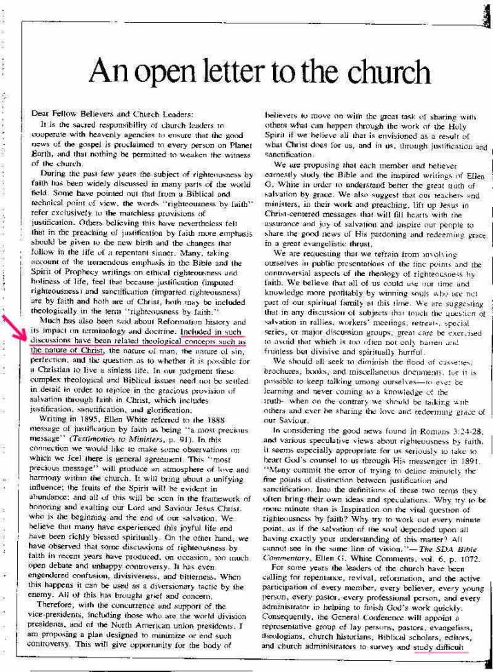 In "An Open Letter to the Church" (Adventist