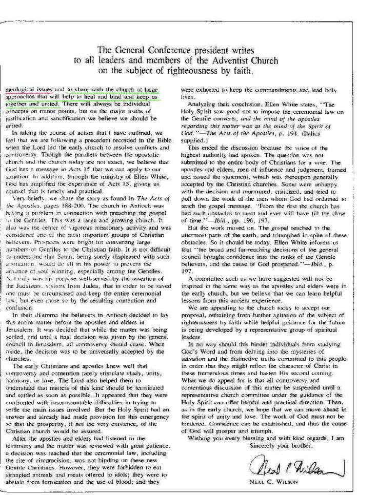 “Nós hoje apelamos para a igreja, que aceite a nossa proposta, abstendo-se de futuras agitações sobre o assunto da justificação pela fé, enquanto direção e ajuda está sendo preparada pelos líderes espirituais. Nós apelamos para que toda a discussão contensiosa sobre esse assunto seja suspensa até que o comitê representativo da igreja, sob a direção do Espírito Santo, possa oferecer ajuda e direção. Então, como na igreja primitiva, em espírito de unidade e amor possamos seguir para a frente.”